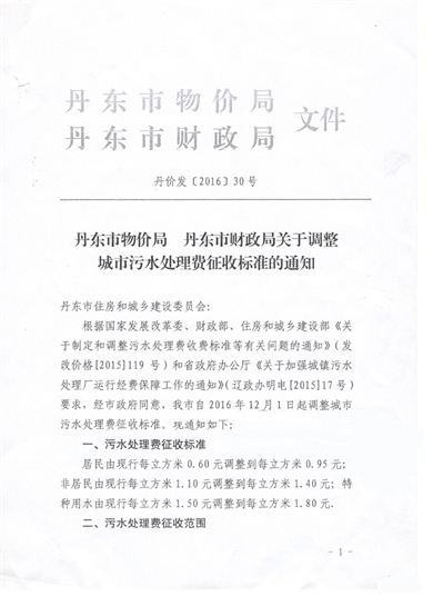 丹東市物價(jià)局 丹東市財(cái)政局關(guān)于調(diào)整城市污水處理費(fèi)征收標(biāo)準(zhǔn)的通知2017-06-15